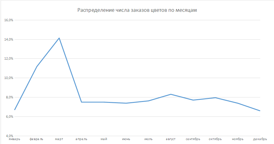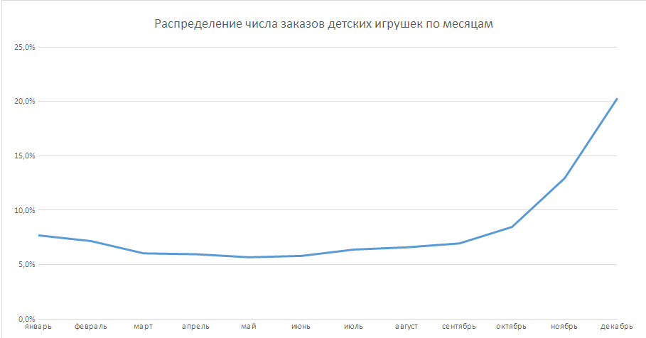 Так, например, выглядит распределение числа заказов на детские игрушки по месяцам года - декабрьские продажи детских игрушек превышают летний период в 4 раза: